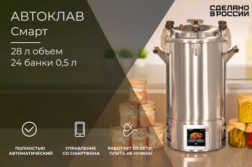 АВТОКЛАВ «СМАРТ» — СОВРЕМЕННОЕ, ТЕХНОЛОГИЧНОЕ И БЕЗОПАСНОЕ УСТРОЙСТВОДавно мечтаете о собственном автоклаве, но сомневаетесь, что справитесь с процессом? Думаете, что нужно постоянно следить за температурой и временем? Забудьте обо всех этих хлопотах! Автоклав «Смарт» полностью изменит ваше представление о домашнем консервировании.
