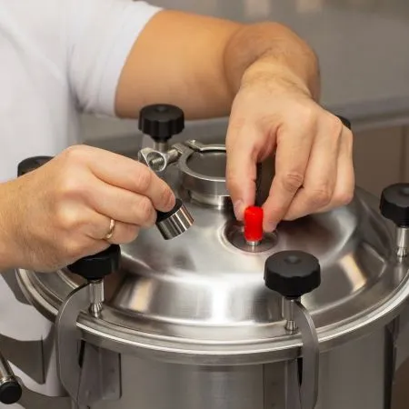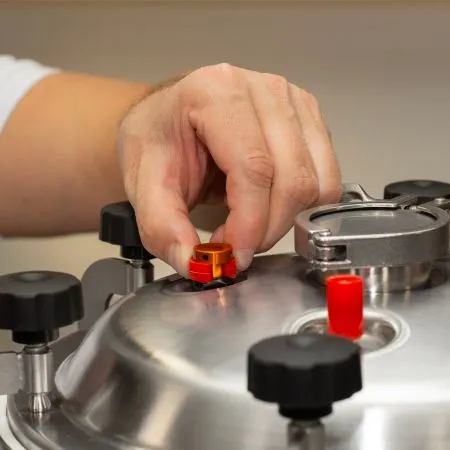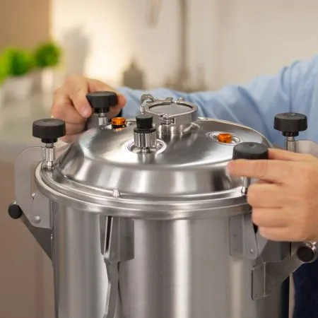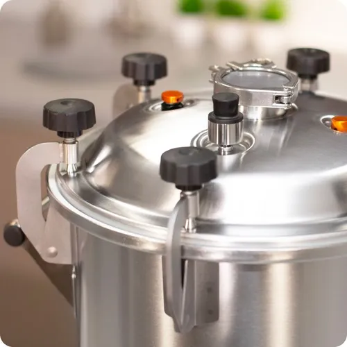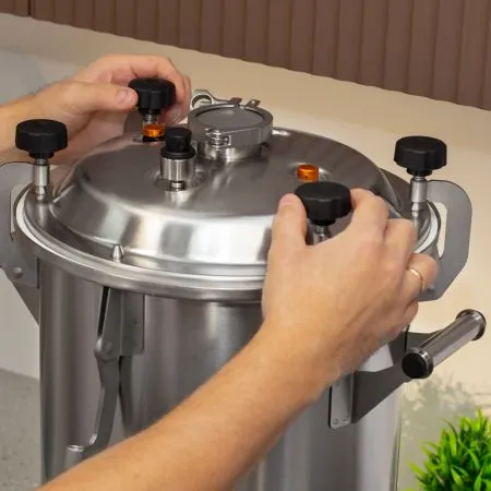 Крышка герметично фиксируется шестью запорными крюками. Автоклав оснащен удобными ручками на корпусе и противоскользящими ножками, которые устойчивы на любой поверхности.